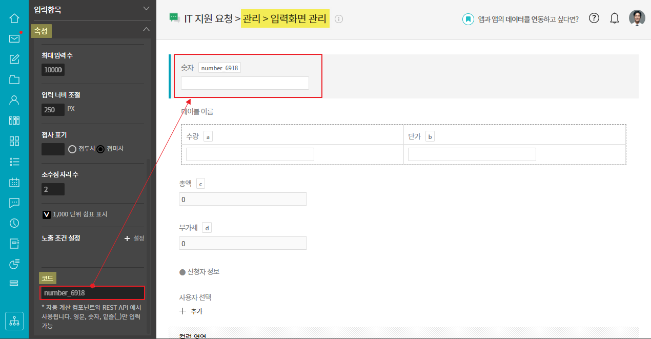 works ▶ 관리화면 ▶ 입력화면 ▷ 삽입되어있는 항목 클릭 ▷ 좌측의 속성 ▷ 코드 수정