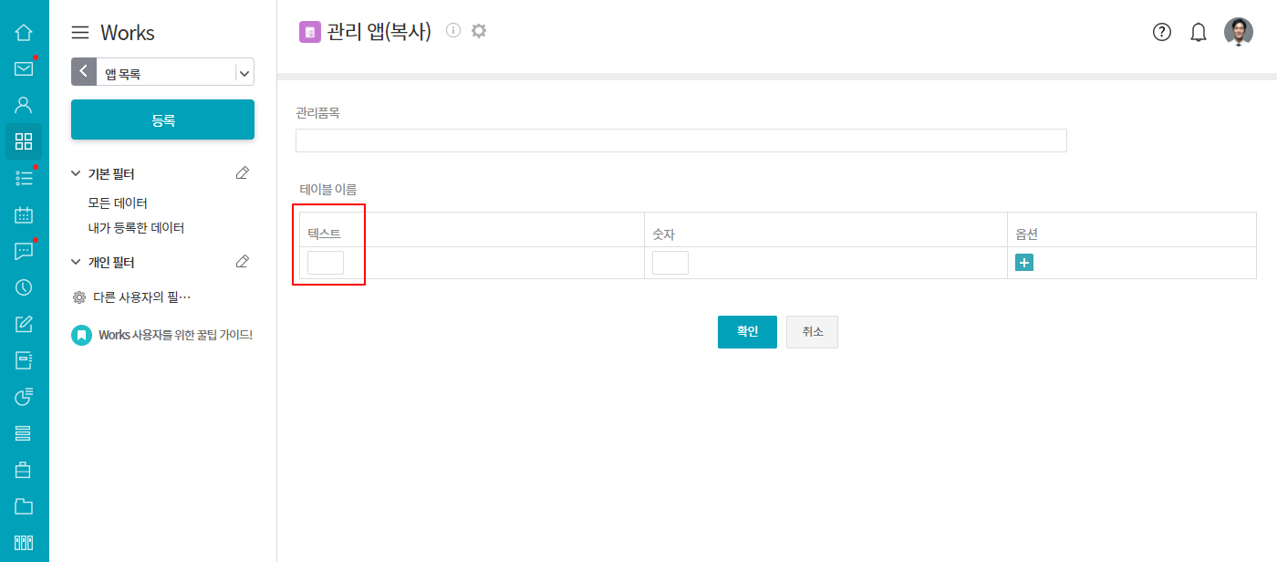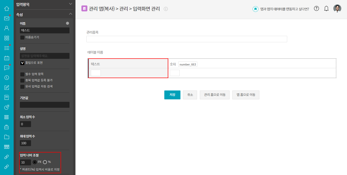 테이블영역에 추가한 입력항목들의 칸 크기는 입력항목 속성의 [입력 너비 조절] 에서 조절할 수 있습니다.