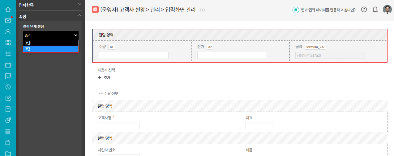 ② 컬럼(다단) 항목 드래그&드랍으로 추가 ▷ 컬럼 항목 안에 숫자, 자동 계산 항목 드래그&드랍으로 추가