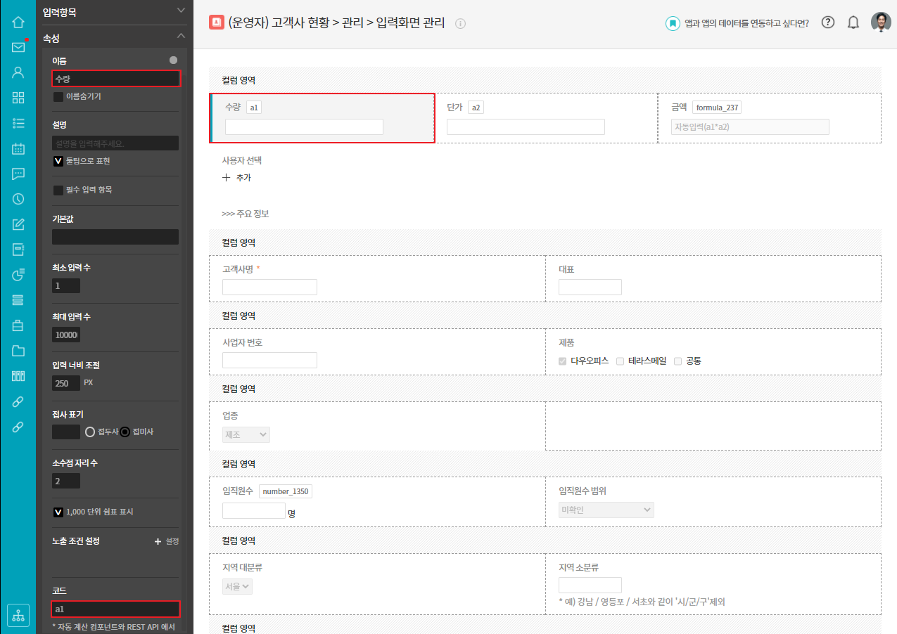 ④ 숫자 항목 클릭 ▷ 이름 수량으로 변경 ▷ 코드 a1 입력