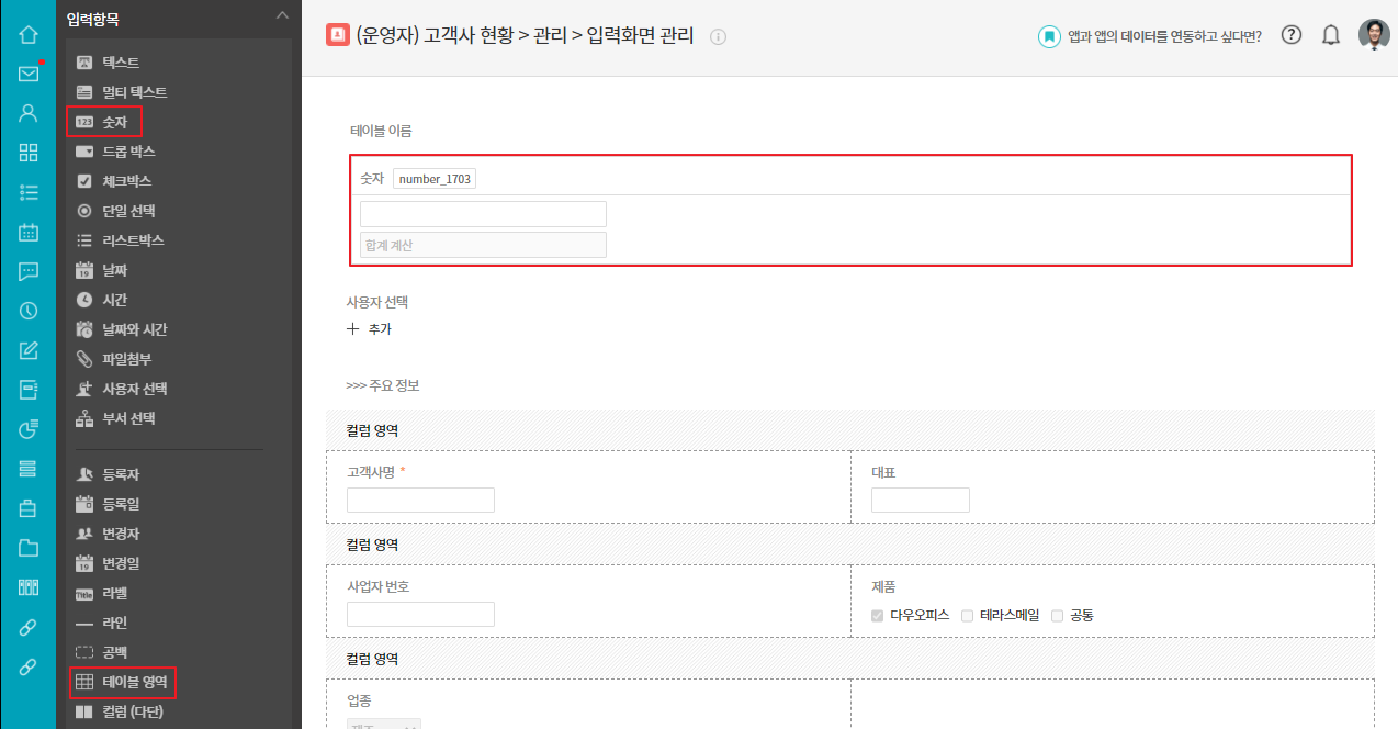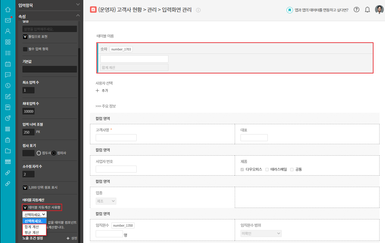 자동계산 항목으로 숫자,날짜, 시간계산과 테이블 영역의 합계/평균을 계산할 수 있습니다.
