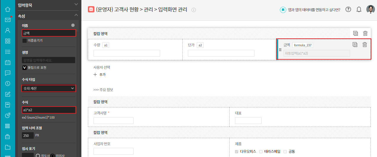 ⑥ 자동 계산 항목 클릭 ▷ 이름 금액으로 변경 ▷ 수식 타입 숫자계산 선택 ▷ 수식 a1*a2 입력 ▷ 저장