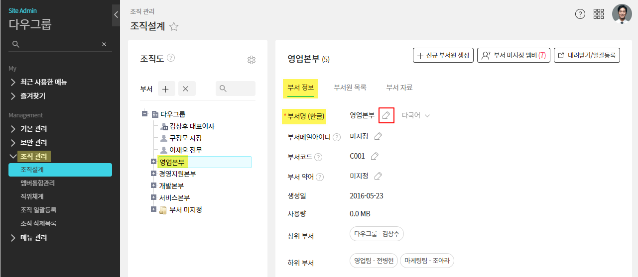 관리자 권한으로 [조직설계]에서 등록된 부서명을 변경할 수 있습니다.
