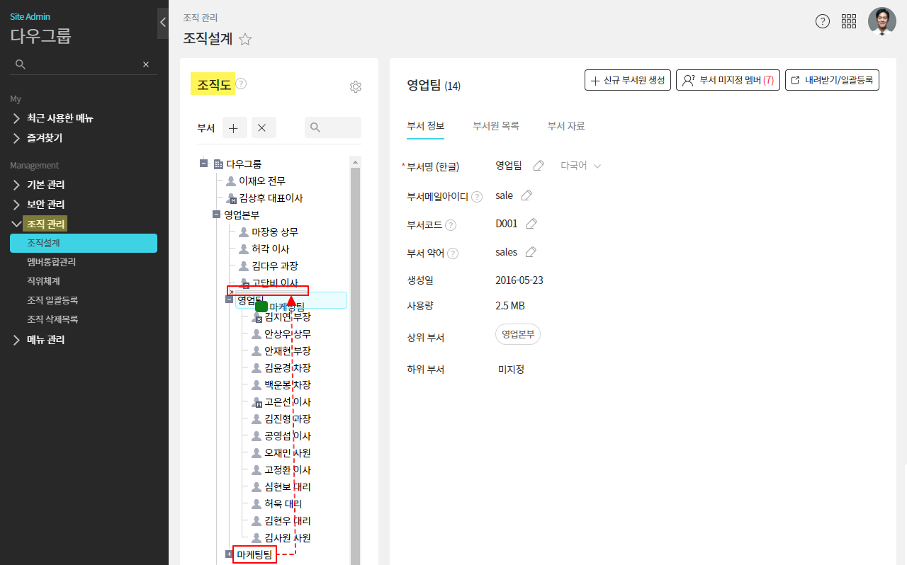 관리자 권한으로 부서 순서를 변경할 수 있습니다.