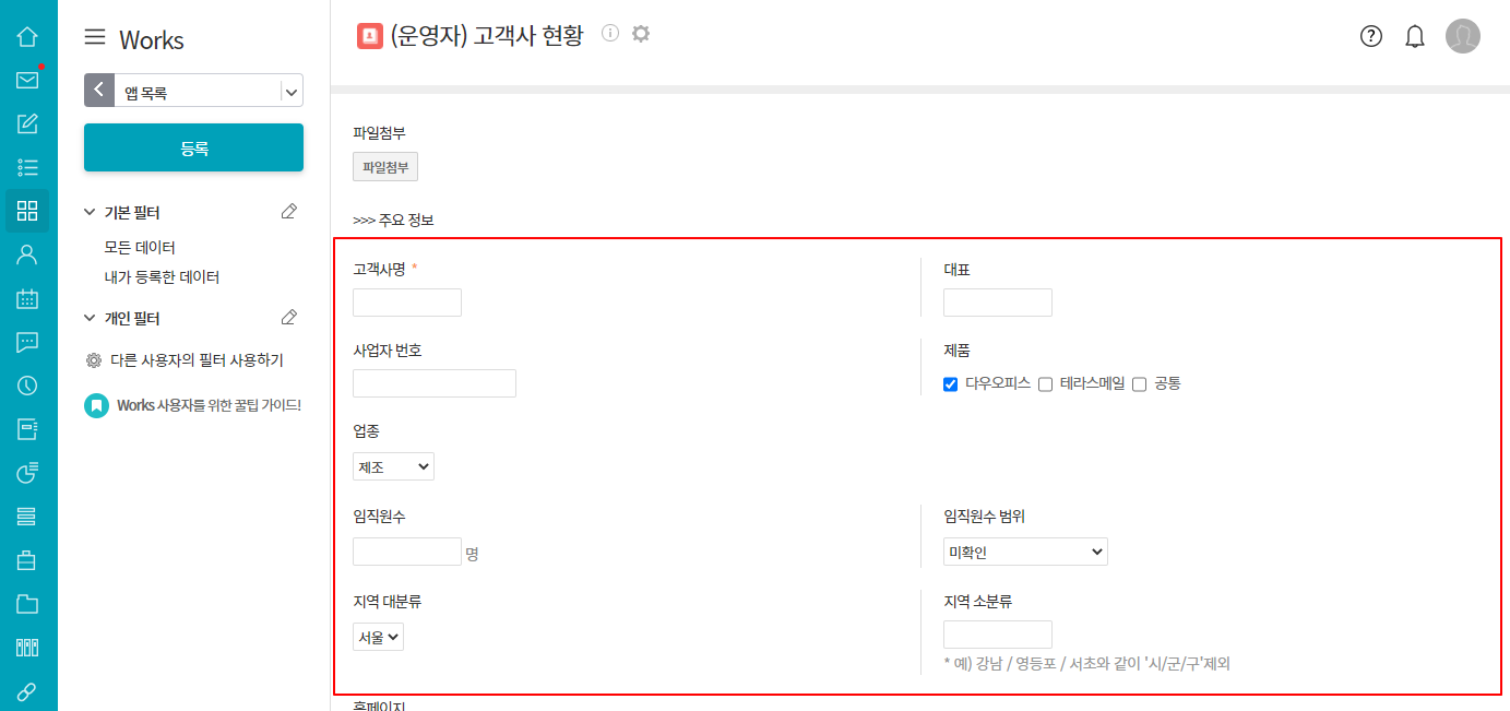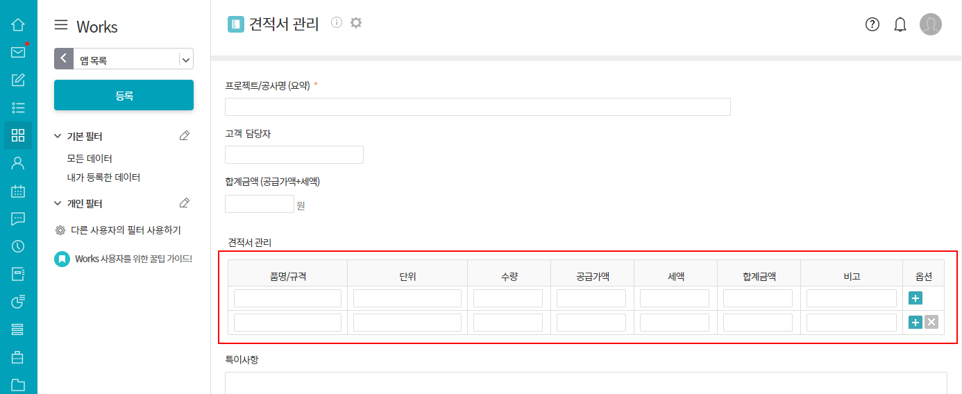 테이블 영역은 단수와 관계 없이 입력항목을 삽입할 수 있으며 데이터 입력 시 행을 추가할 수 있습니다.