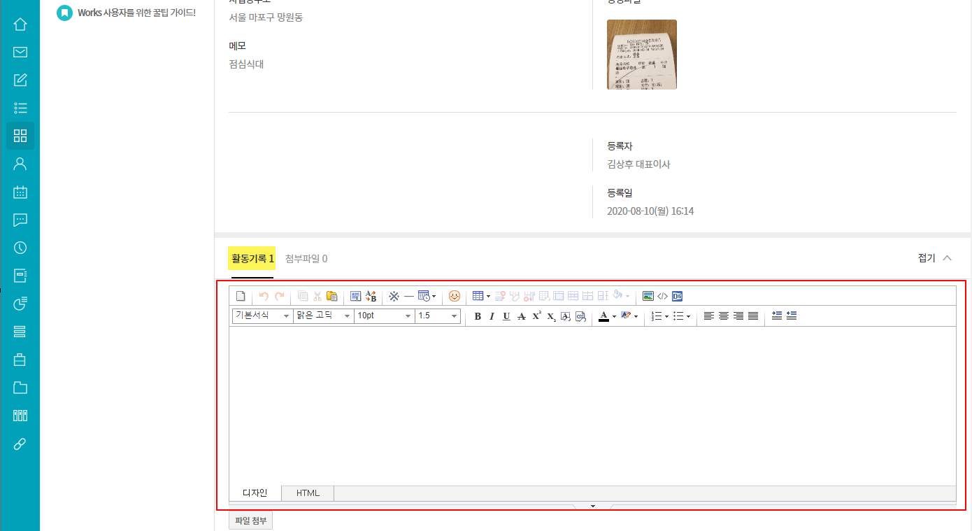 ■ 요약입력 화면에서는 에디터를 삽입할 수 없습니다.데이터 등록 후에 보이는 활동기록의 에디터를 활용하시기 바랍니다.
