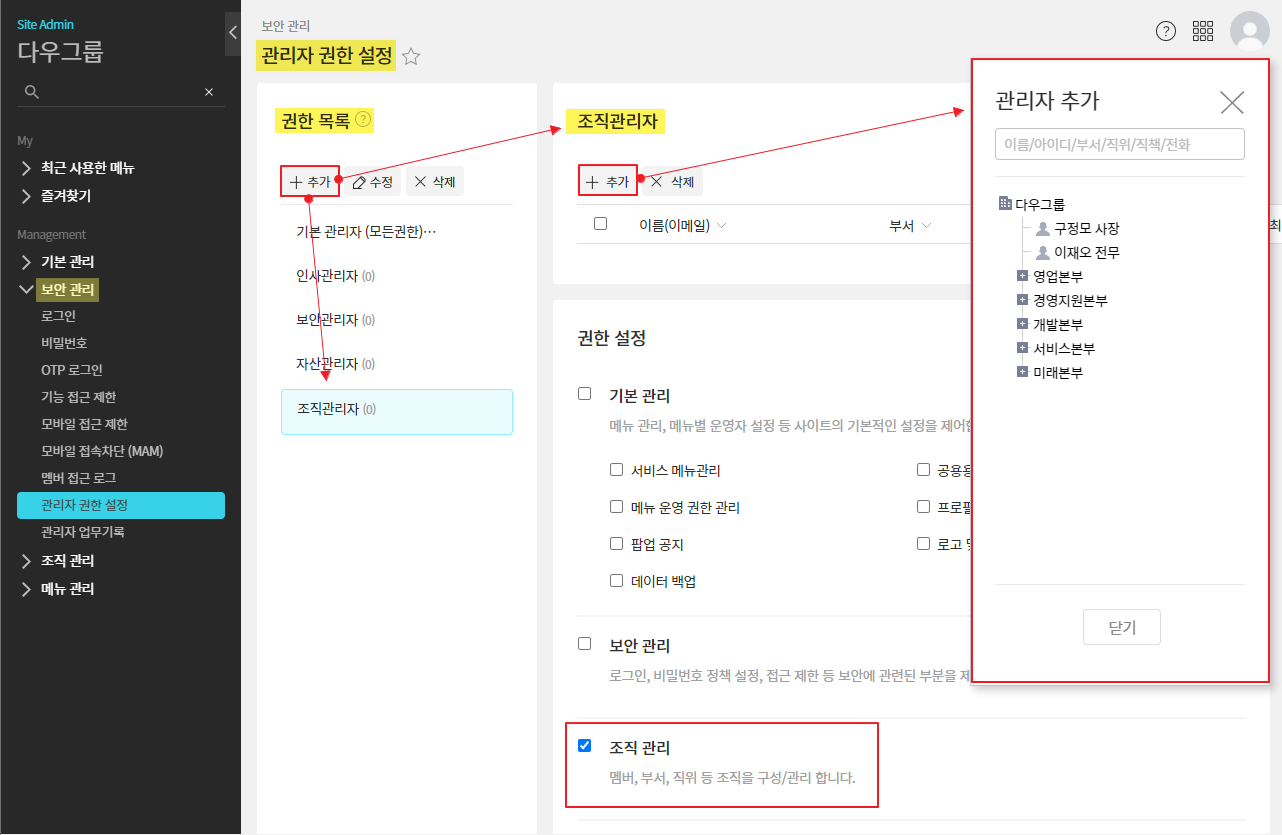 관리자페이지(SiteAdmin) ▶ 보안 관리 ▶ 관리자 권한 설정 ▷ 권한 목록 ▷ + 추가 ▷ 관리자 +추가 ▷ 조직관리 권한 선택