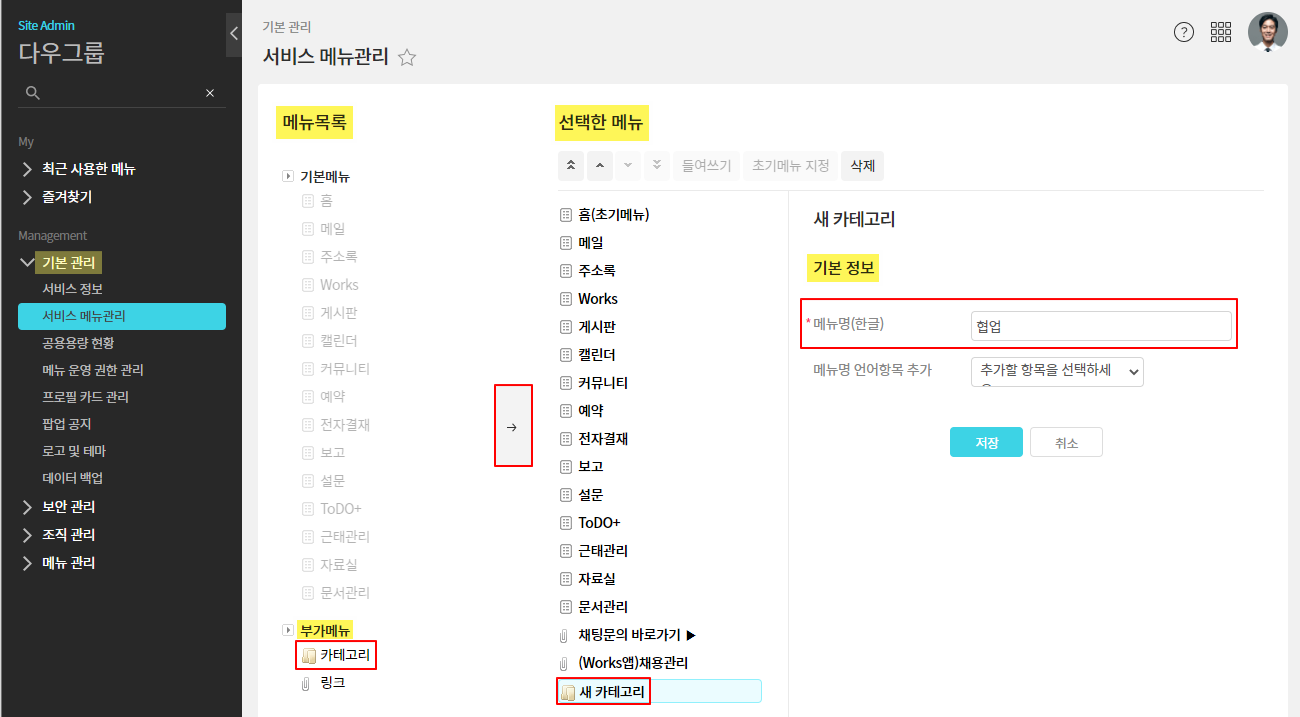 관리자 권한으로 메뉴 [카테고리]를 설정할 수 있습니다.