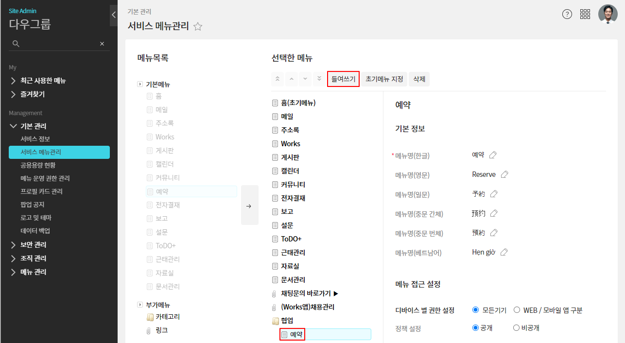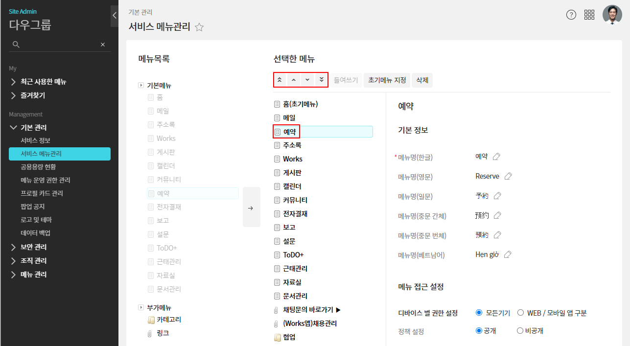 ① 관리자페이지(SiteAdmin) ▶ 기본 관리 ▶ 서비스 메뉴관리 ▶