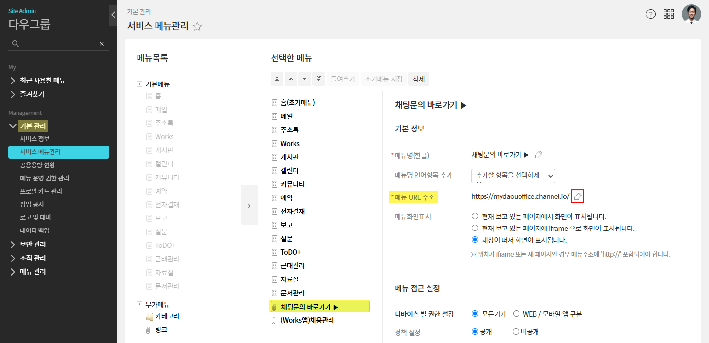 관리자 권한으로 [서비스 메뉴 관리]에서 링크 메뉴의 URL을 수정할 수 있습니다.