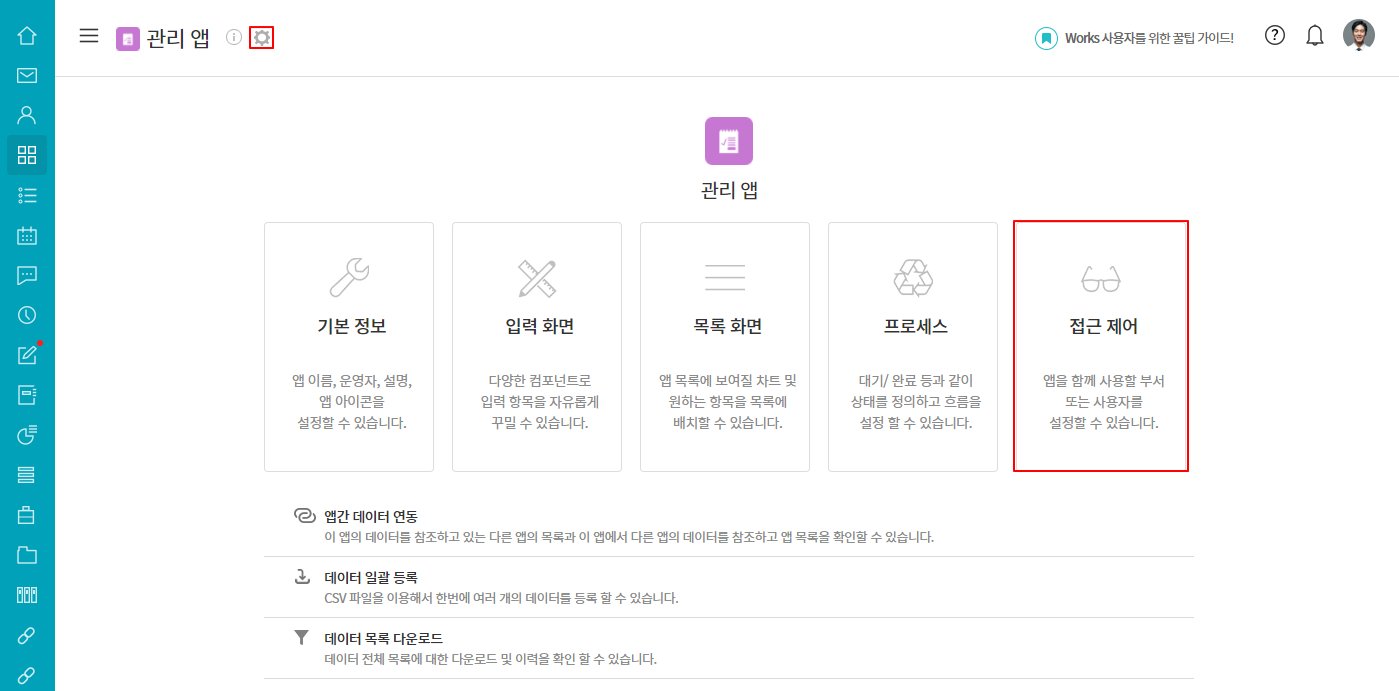 앱 운영자 권한으로 [접근 제어 관리]에서 필터 조건이 설정되어 있는지 확인하시기 바랍니다.