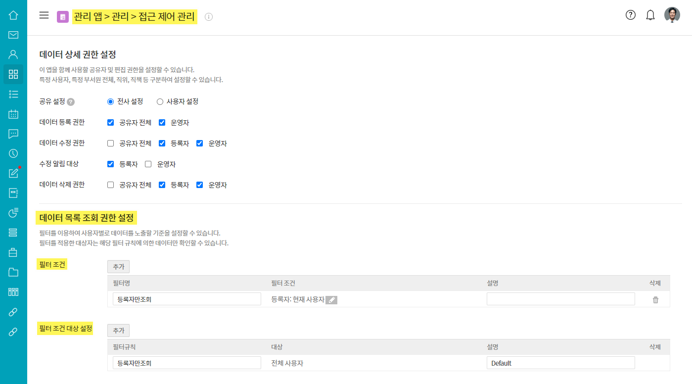 ② 접근 제어 관리 ▷ 데이터 목록 조회 권한 설정 ▷ 필터 조건 확인