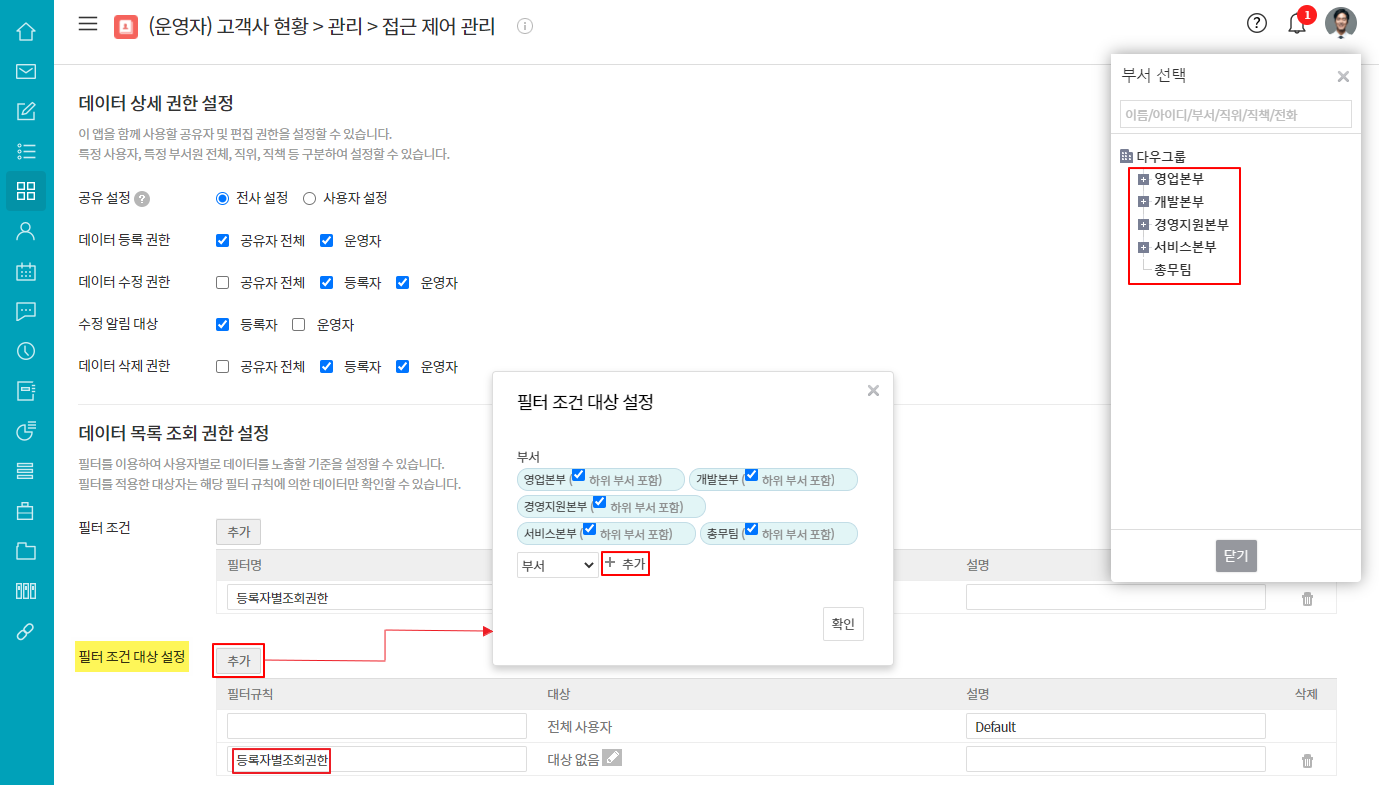 ④ 필터 조건 대상 설정 ▷ 추가 ▷ 필터 조건 대상 설정 박스에서 부서 선택 ▷ + 추가 ▷ 적용할 부서 선택