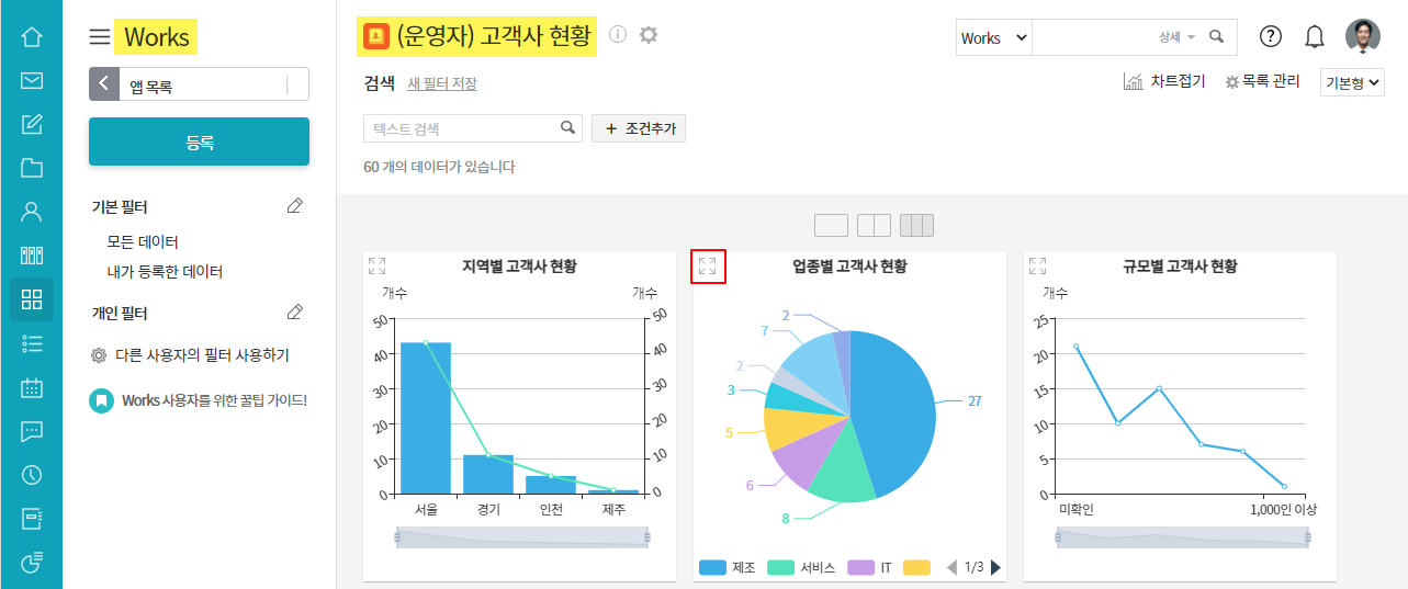 ① Works ▶ 앱 클릭 ▶ 차트 좌측 상단 확대 화살표 클릭