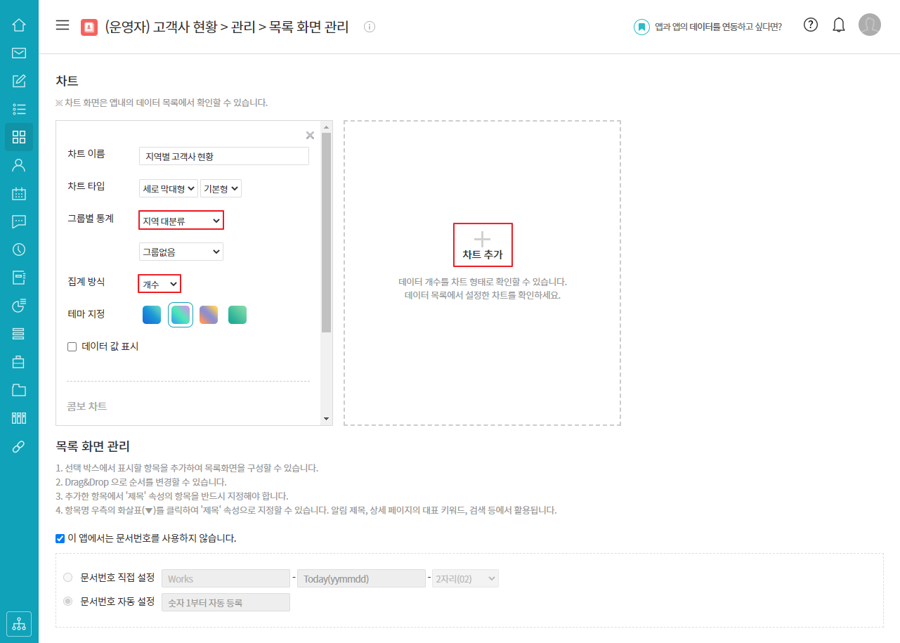 차트로 나타낼 그룹과 집계방식을 설정하여 구성할 수 있습니다.