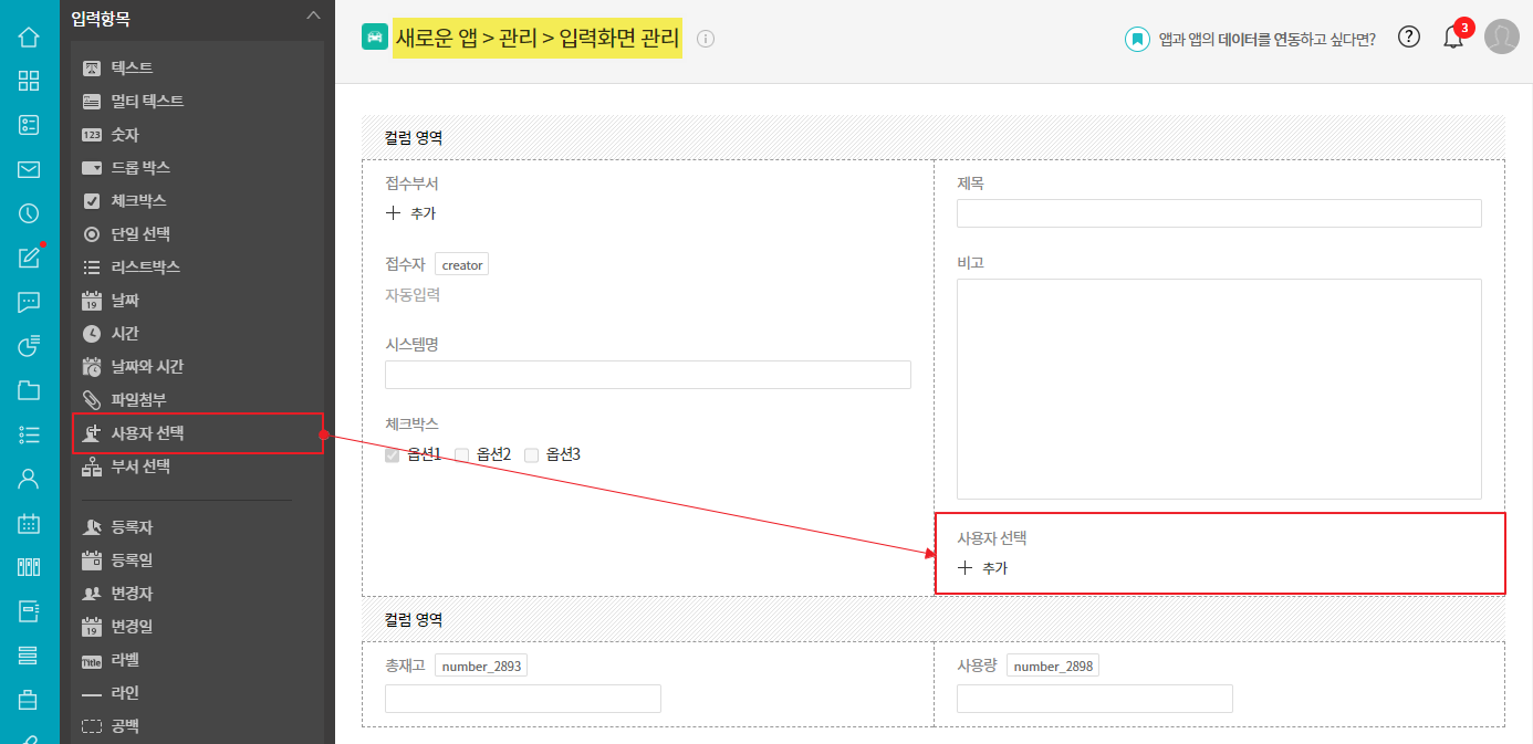 ① 앱 관리 ▶ 입력 화면 ▶ 입력화면 관리 ▷ [사용자 선택] 항목 추가