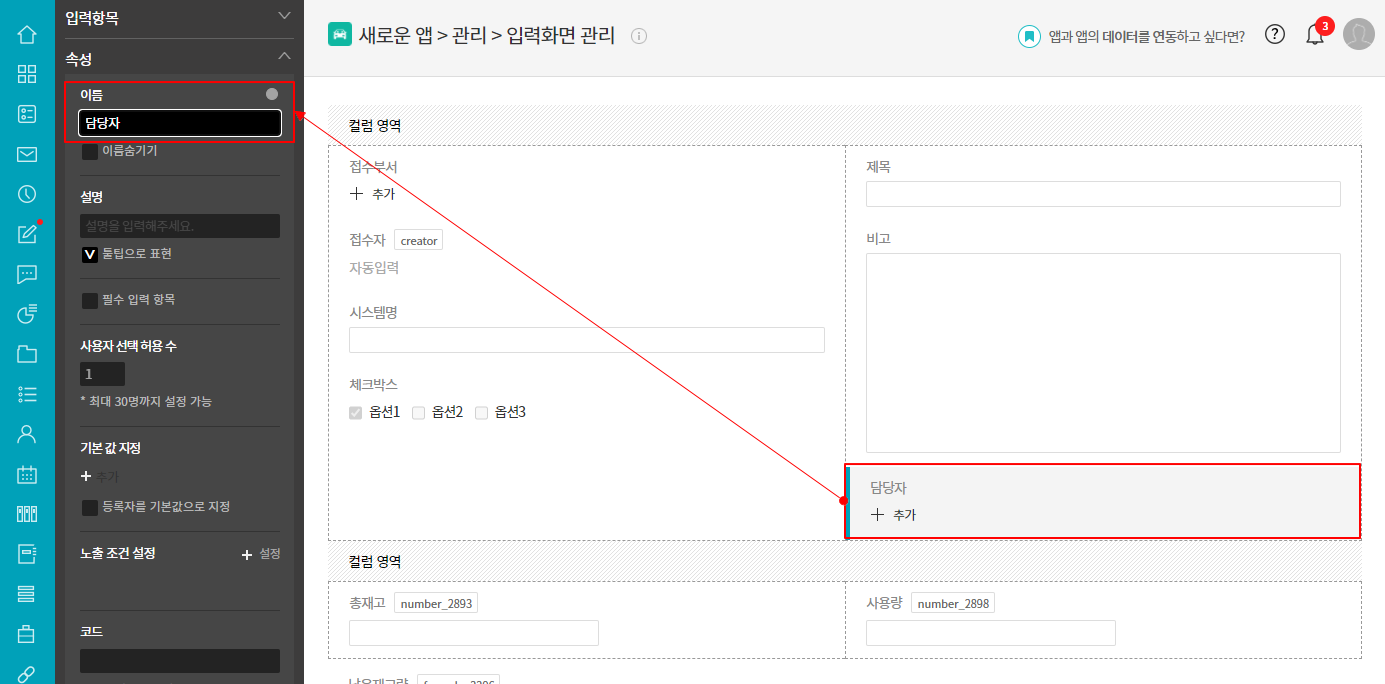 ② 추가한 [사용자 선택] 항목 클릭 ▷ 우측에 나타나는 속성에서 필요할 경우 이름 변경 ▷ 저장