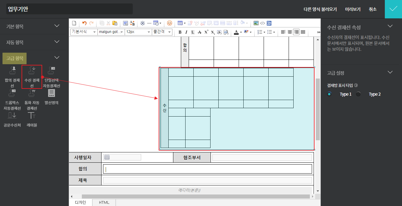 관리자페이지(SiteAdmin) ▶ 메뉴관리 ▶ 전자결재 ▶ 결재양식 관리 ▶ 양식 편집기 ▷ 고급항목 ▷ 수신 결재선