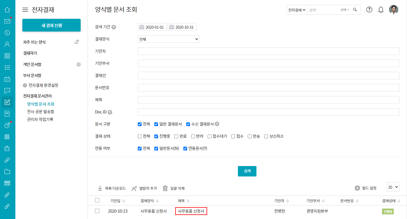 ① 전자결재 ▶ 전자결재 문서관리 ▶ 양식별 문서 조회 ▶ 검색기간 설정 ▷ 결재 상태 : 진행중 체크 ▷ 검색