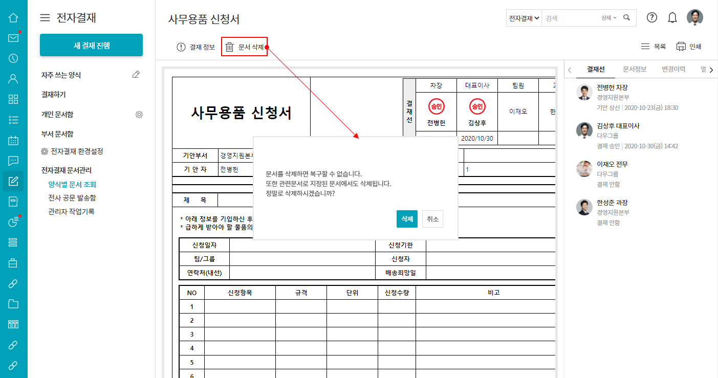 미결재(진행 중)인 문서는 삭제할 수 없습니다.
