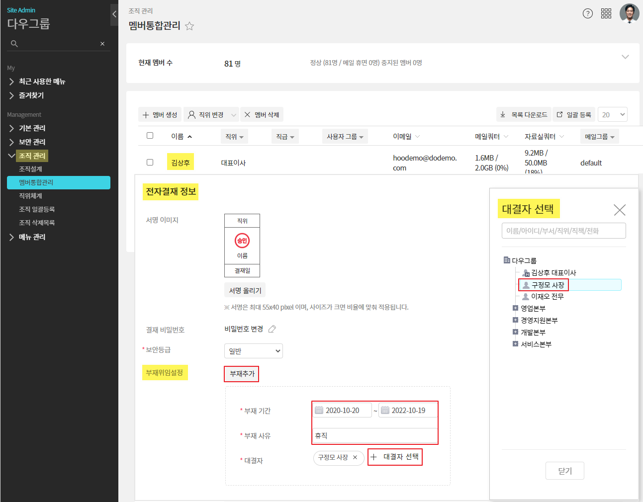 사용자가 이미 휴직중인 경우, 관리자 권한으로 대결자를 추가할 수 있습니다.