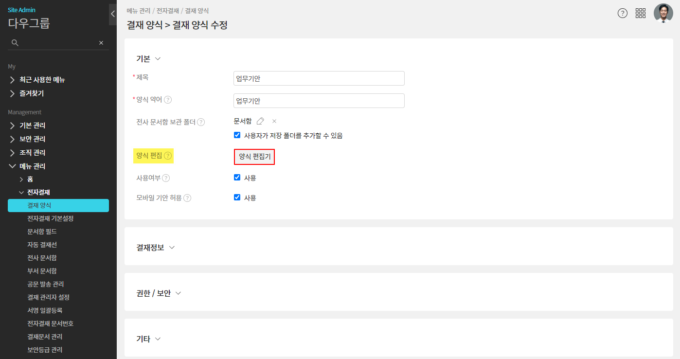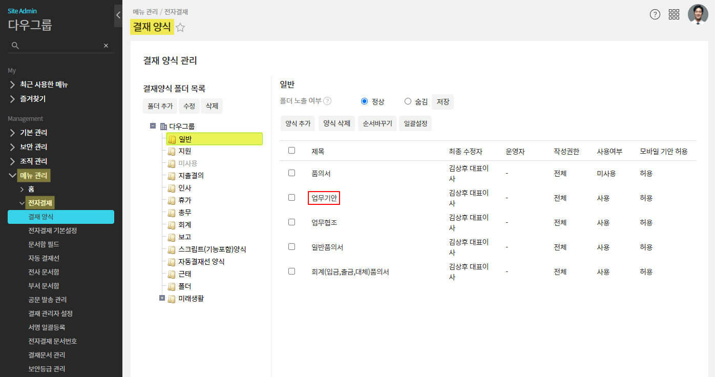 ① 관리자페이지(SiteAdmin) ▶ 메뉴 관리 ▶ 전자결재 ▶ 결재 양식 ▶ 폴더 선택 ▷ 양식 선택