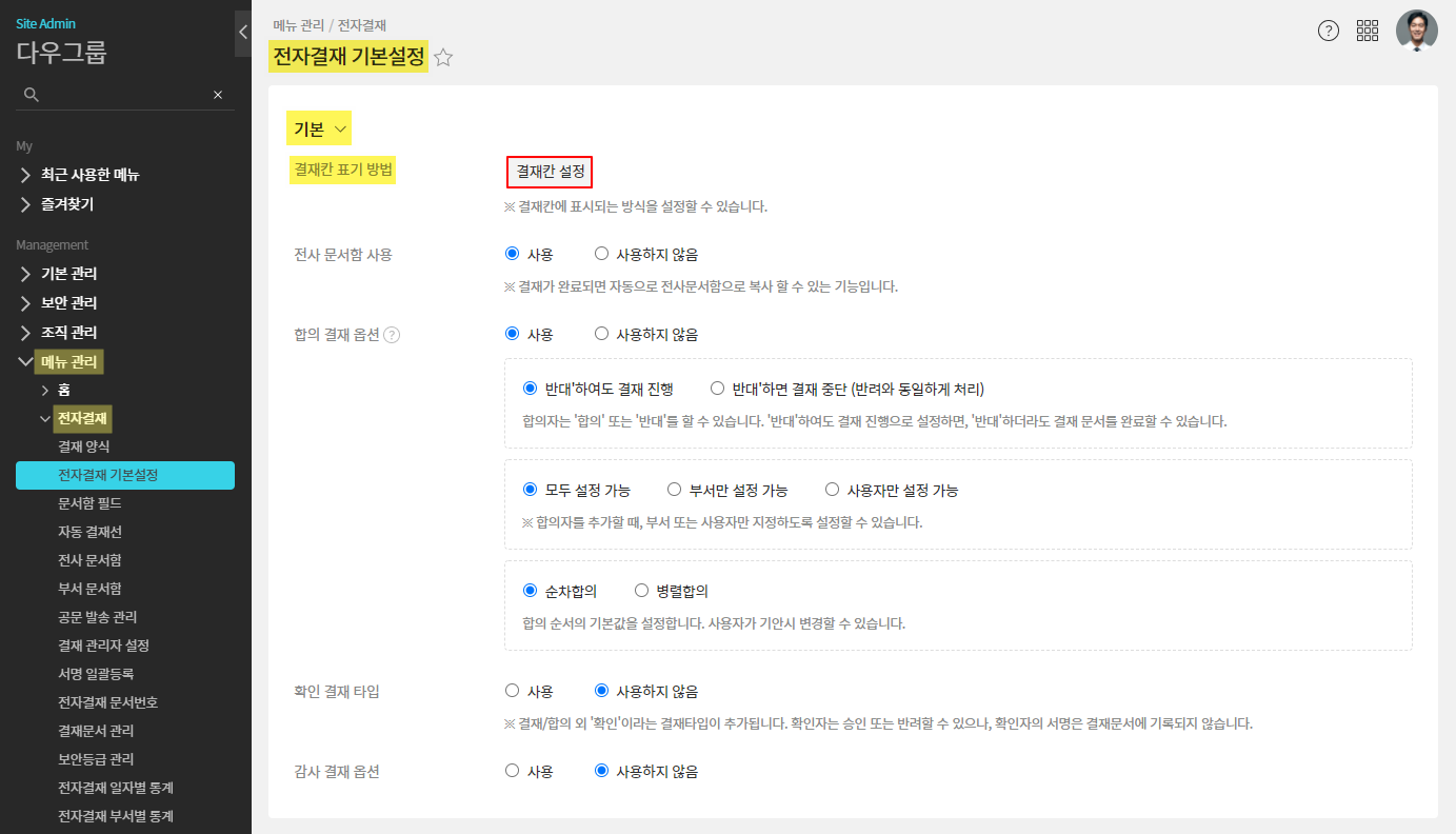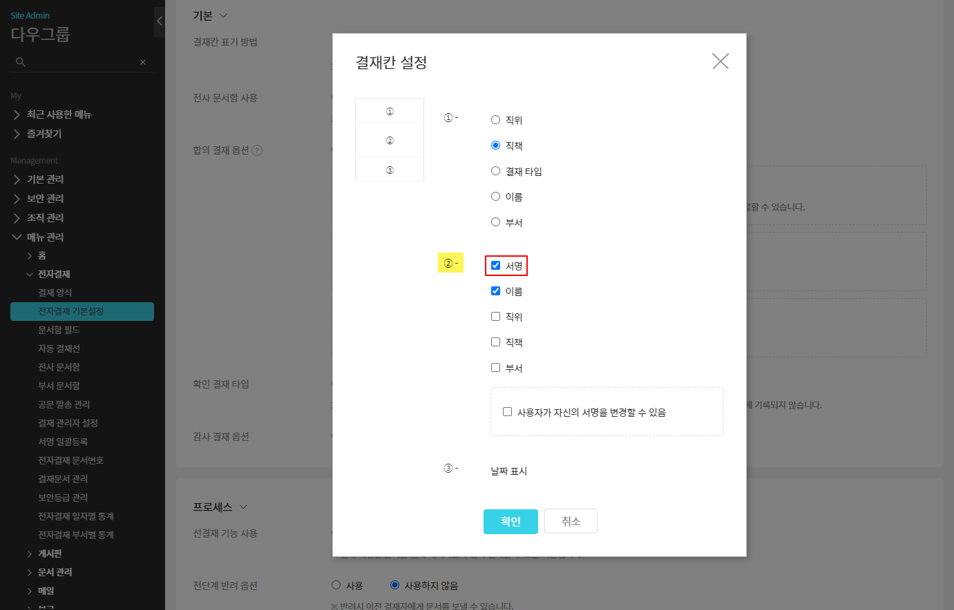 ① 관리자페이지(SiteAdmin) ▶ 메뉴 관리 ▶ 전자결재 ▶ 전자결재 기본설정 ▶ 기본 ▷ 결재간 표기 방법 ▷ 결재칸 설정