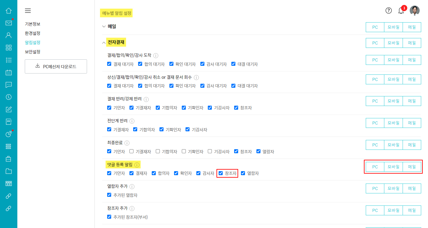 ② 메뉴별 알림 설정 ▷ 전자결재 ▷ 댓글 등록 알림 ▷ 참조자 체크 ▷ 알림 받고자 하는 경로 선택 ▷ 저장