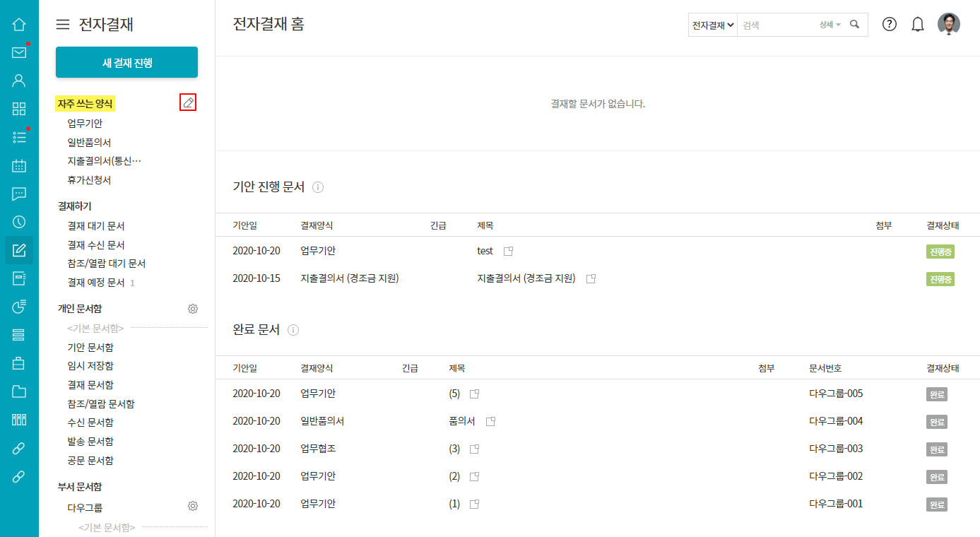 ① 전자결재 ▶ 자주 쓰는 양식 우측의 연필모양 아이콘 클릭