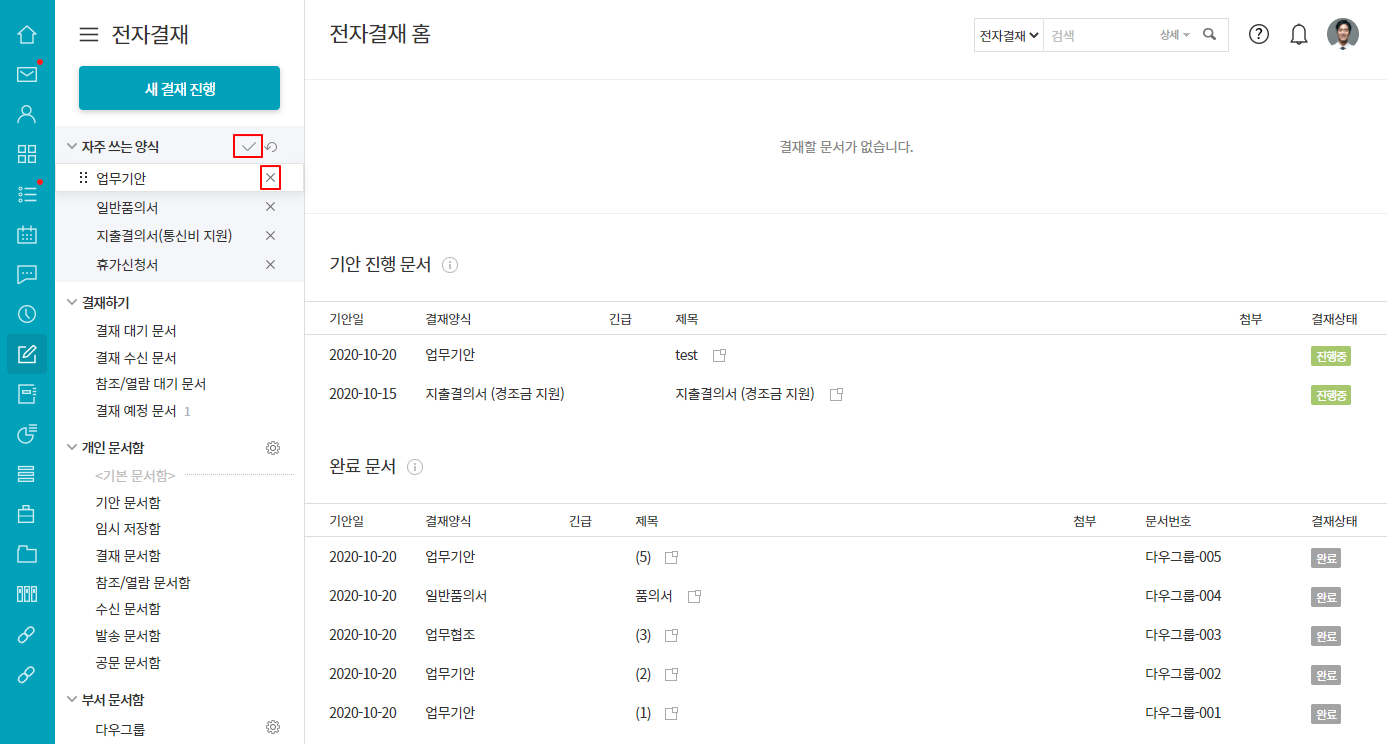 자주 쓰는 양식 우측의 연필 모양 아이콘을 클릭하여 편집 및 삭제할 수 있습니다.