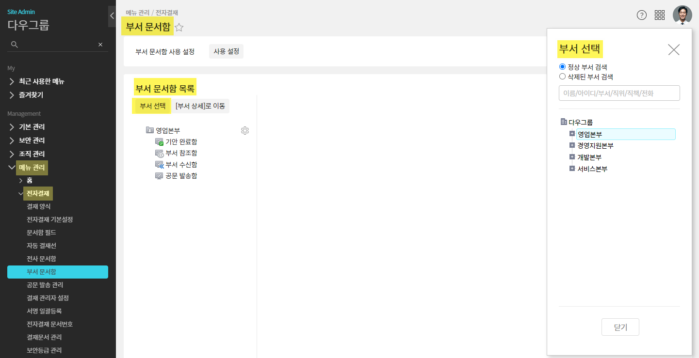 ① 관리자페이지 ▶ 메뉴 관리 ▶ 전자결재 ▶ 부서 문서함 ▷ 부서 문서함 목록 ▷ 부서 선택 ▷ 해당 부서 선택