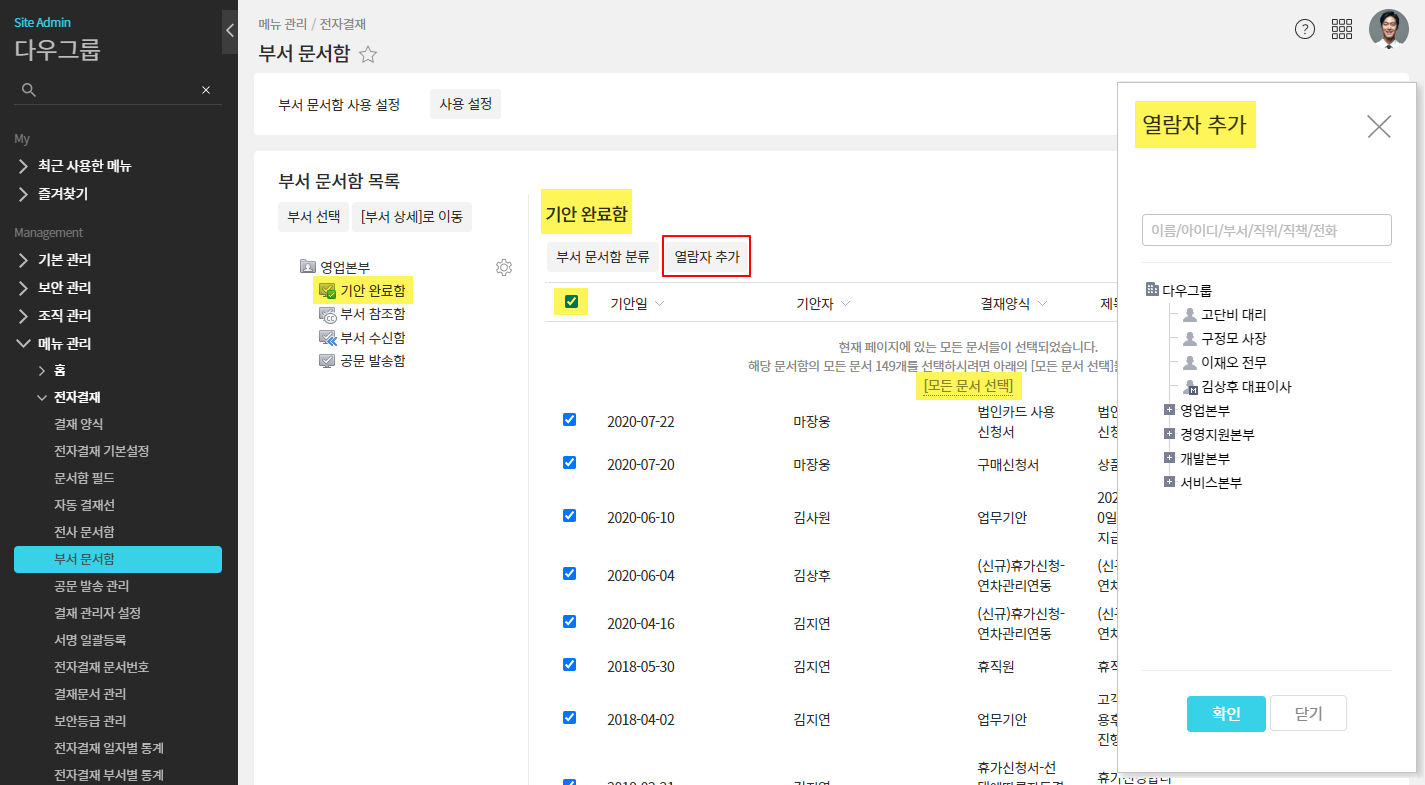 관리자 권한으로 부서 문서함에 있는 문서들에 대해 열람 권한을 부여하시기 바랍니다.