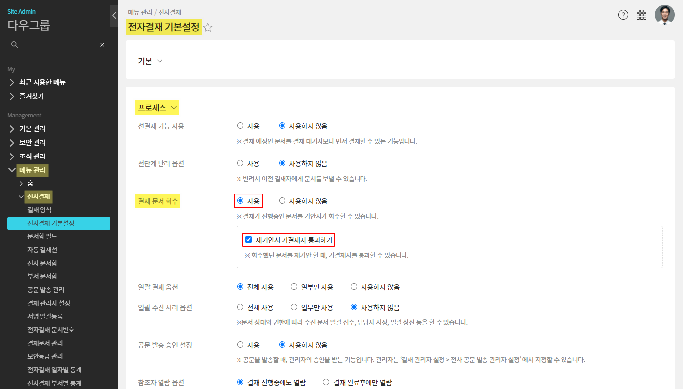 - 관리자페이지(SiteAdmin) ▶ 메뉴 관리 ▶ 전자결재 ▶ 전자결재 기본설정 ▶ 프로세스 ▷ 결재 문서 회수 : 사용 ▷
