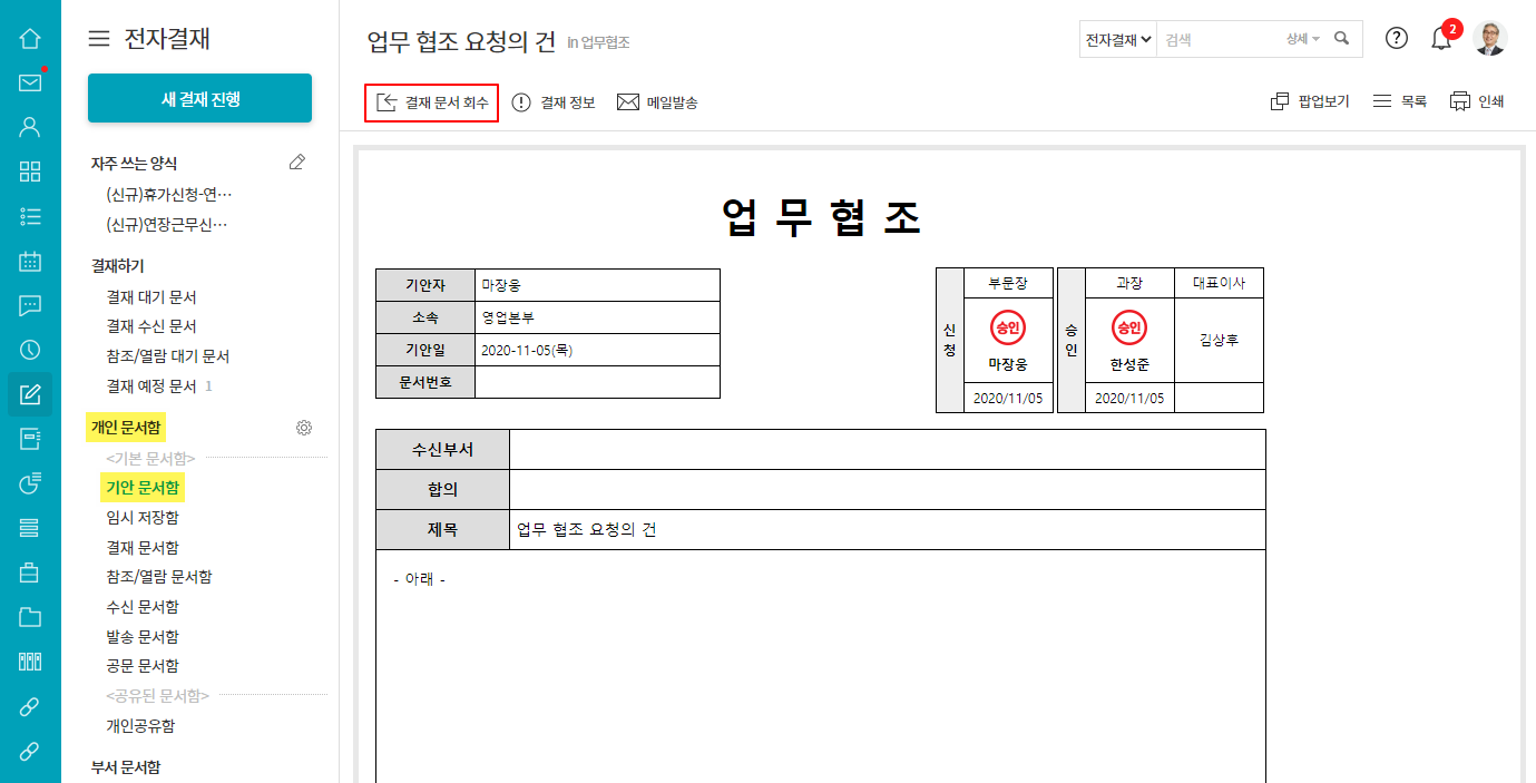 - [결재 문서 회수]로 회수한 문서의 내용은 수정할 수 없습니다.