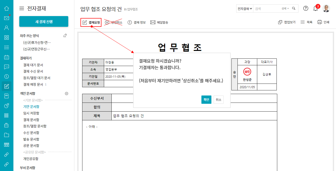 문서 수정 혹은 결재선 수정이 필요할 경우에는 상신 취소 후 처음부터 재기안하시기 바랍니다.