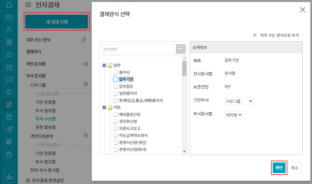 ① 전자결재 ▶새 결재 진행 ▷ 기안할 양식 클릭 ▷ 확인