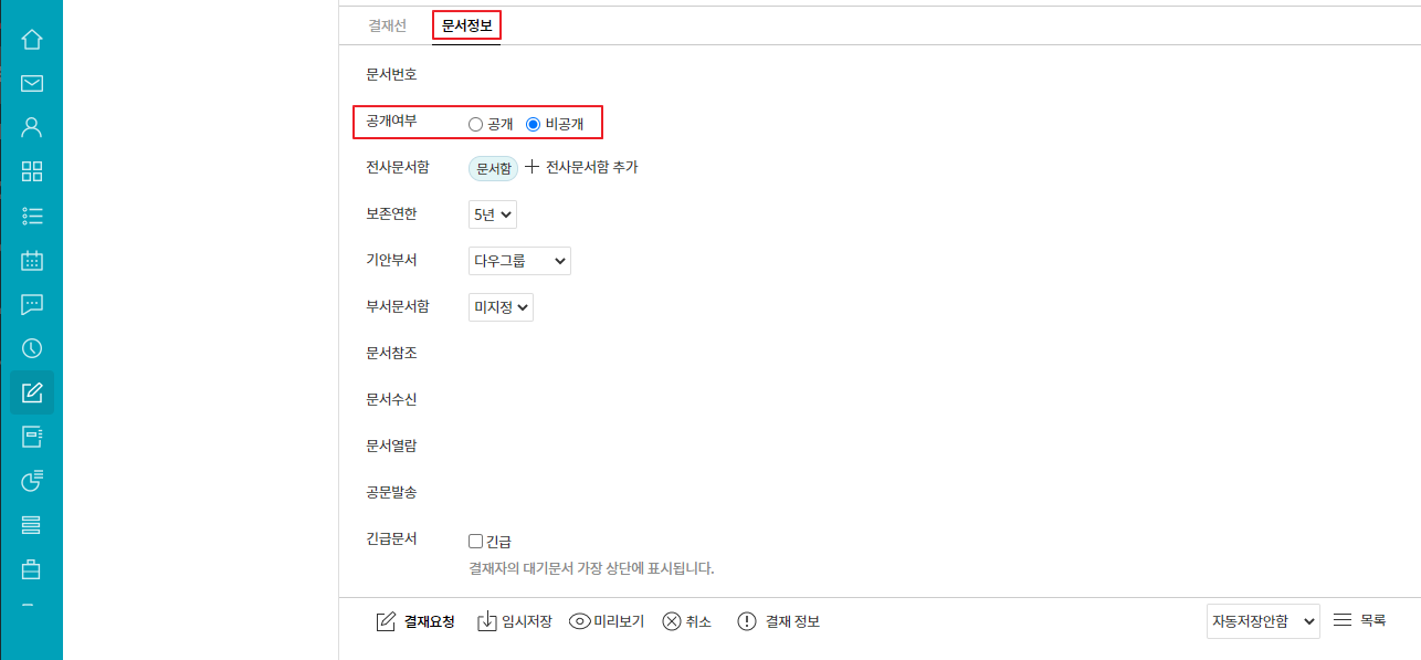 ② 기안화면 하단의 문서정보 탭 클릭 ▷ 공개여부 설정 ▷ 기안