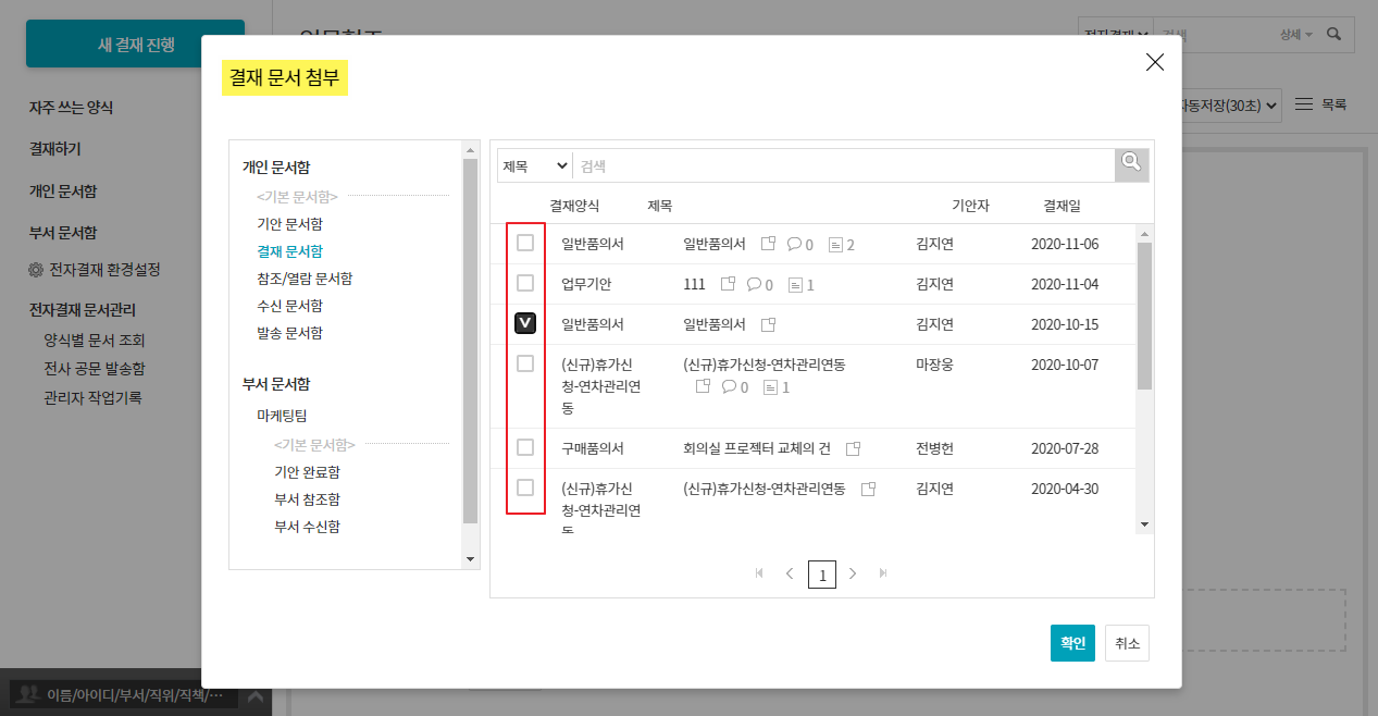 개인 문서함, 부서 문서함, 전사 문서함에 있는 열람 권한이 있는 문서들을 연결할 수 있습니다.
