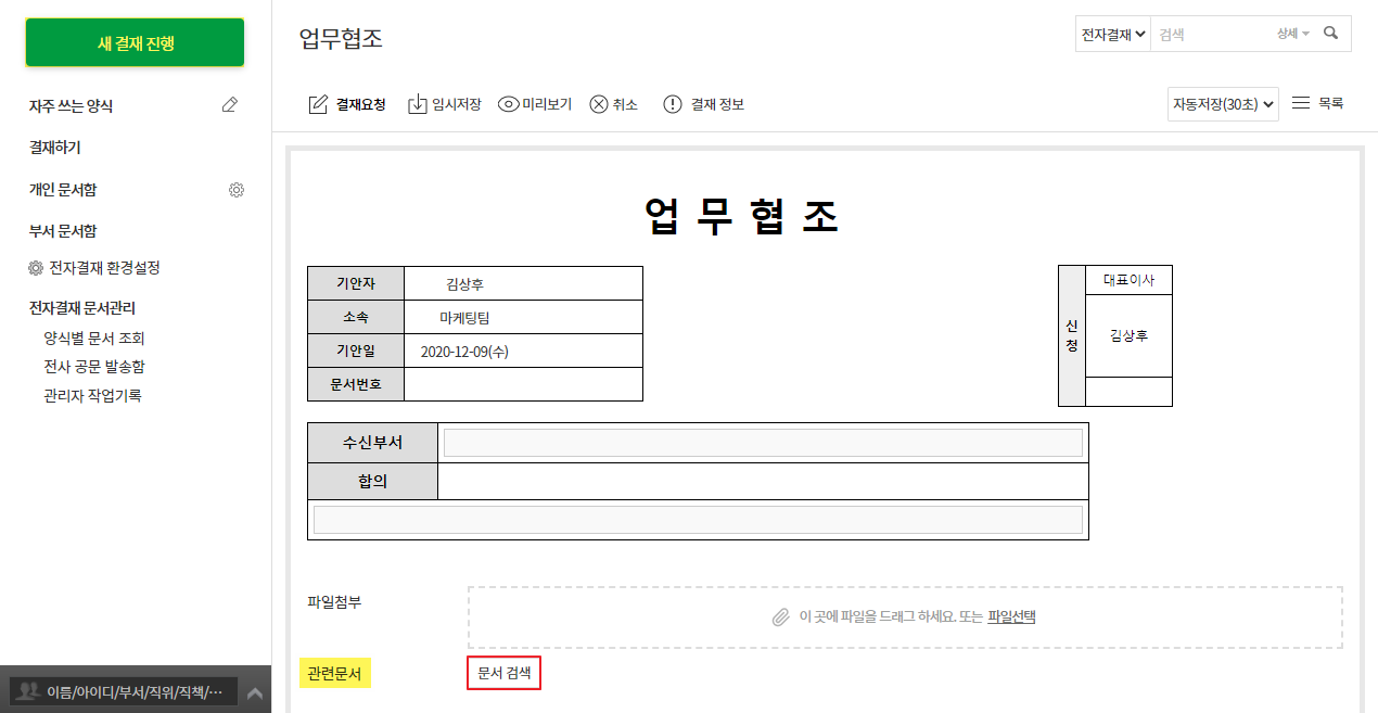 ① 전자결재 ▶ 새 결재 진행 ▶ 문서 하단의 관련문서 ▷ 문서 검색
