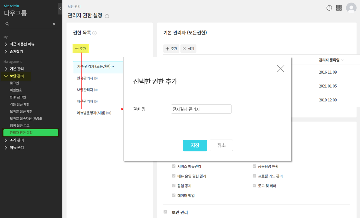 ① 관리자페이지(SiteAdmin) ▶ 보안 관리 ▶ 관리자 권한 설정 ▶ 권한 목록 ▷ + 추가 ▷ 권한 명 입력 ▷ 저장