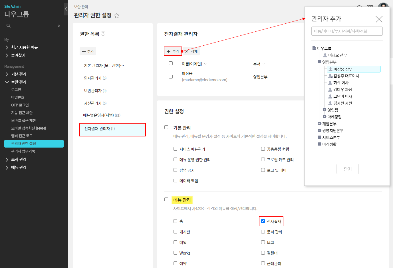 관리자 권한으로 전자결재 메뉴에 대한 관리자를 설정할 수 있습니다.