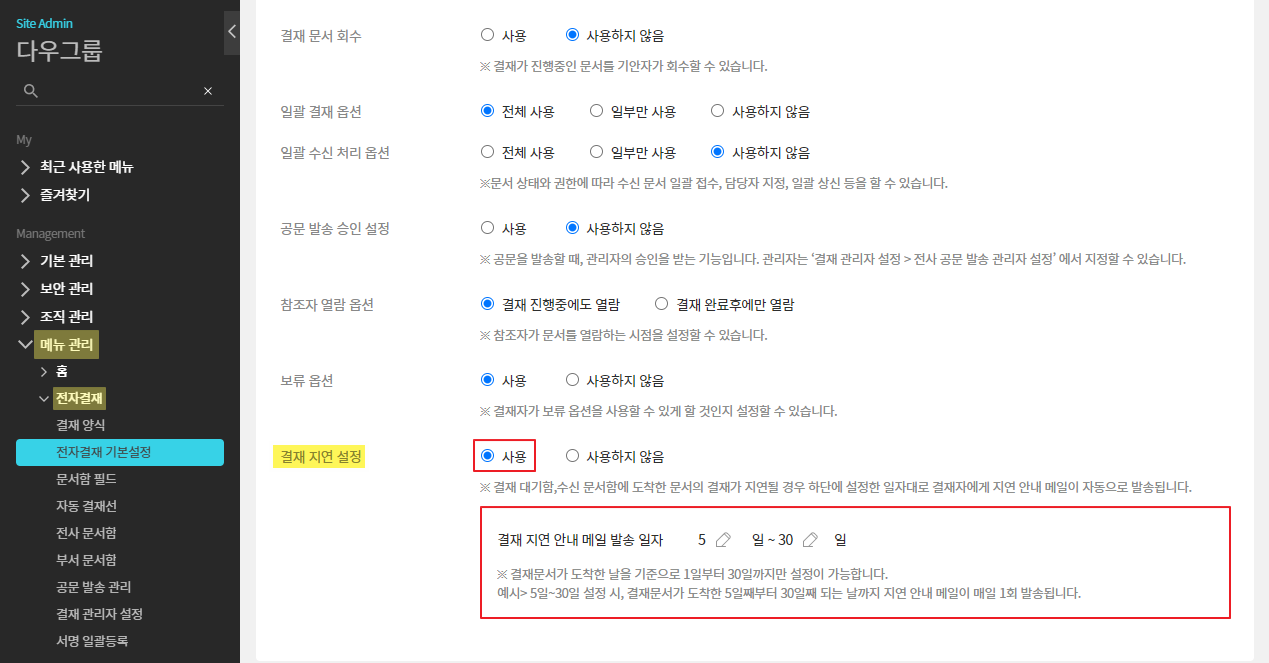 ▷ 결재 지연 설정 : 사용 ▷ 안내 메일 발송 일자 설정