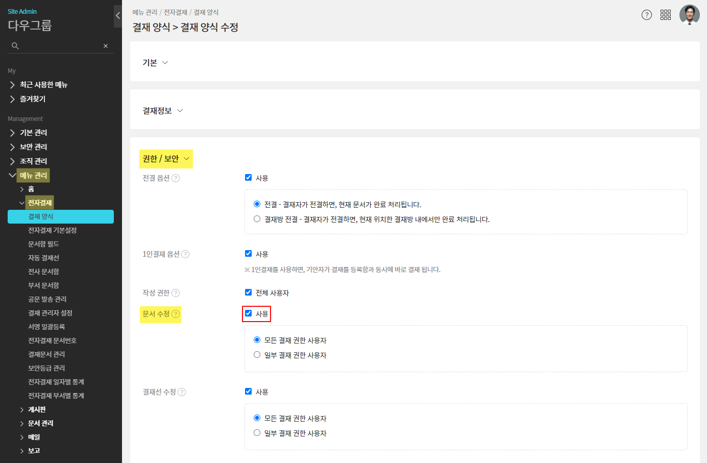 <결재선 수정 옵션 체크 방법>