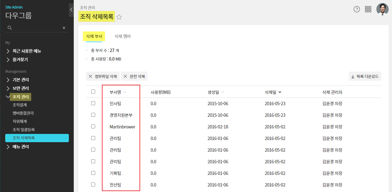 ① 관리자페이지 ▶ 조직관리 ▶ 조직 삭제목록 ▶ 삭제부서 탭 ▷ 부서명 클릭