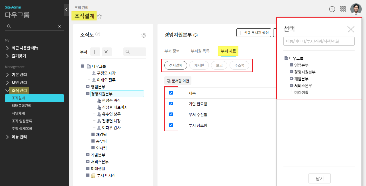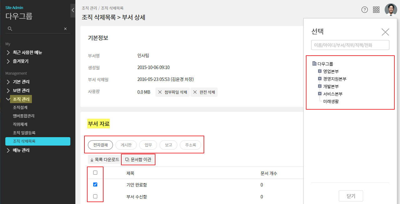 부서 자료는 전자결재 / 게시판 / 보고 / 주소록을 이관할 수 있습니다.