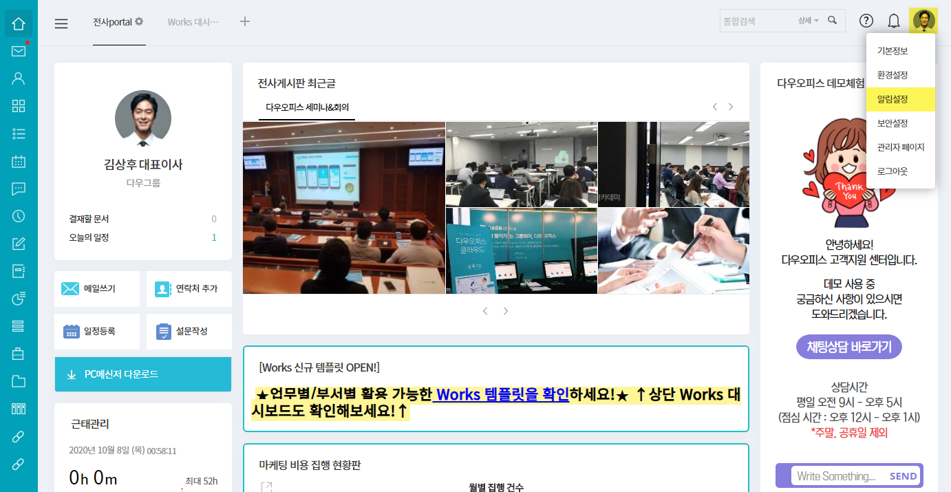 ① 그룹웨어 우측 상단의 프로필 사진 클릭 ▶ 알림 설정