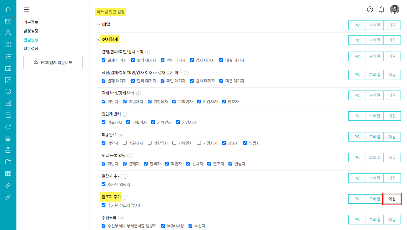 ② 메뉴별 알림 설정 ▷ 전자결재 ▷ 참조자 추가 ▷ 메일 수신 해제(비활성화)