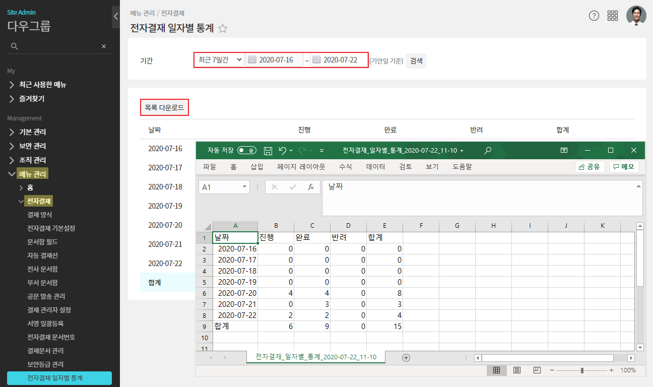 - 관리자페이지(SiteAdmin) ▶ 메뉴 관리 ▶ 전자결재 ▶ 전자결재 일자별 통계