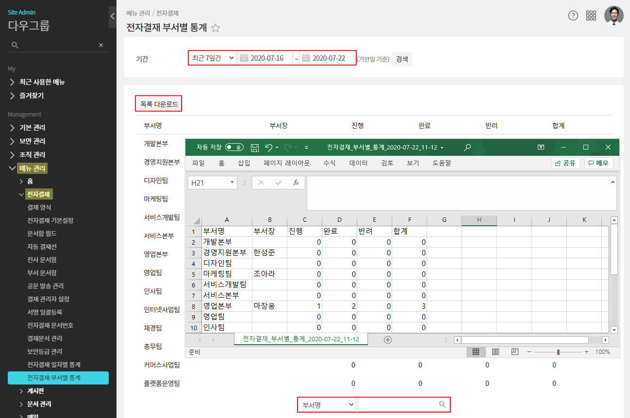 - 관리자페이지(SiteAdmin) ▶ 메뉴 관리 ▶ 전자결재 ▶ 전자결재 부서별 통계