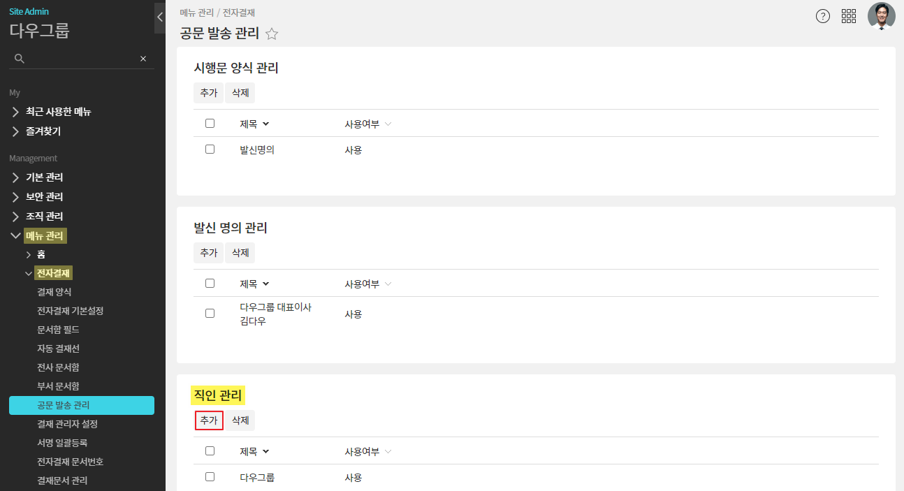 ② 메뉴 관리 ▶ 전자결재 ▶ 공문 발송 관리 ▶ 직인 관리 ▷ 추가